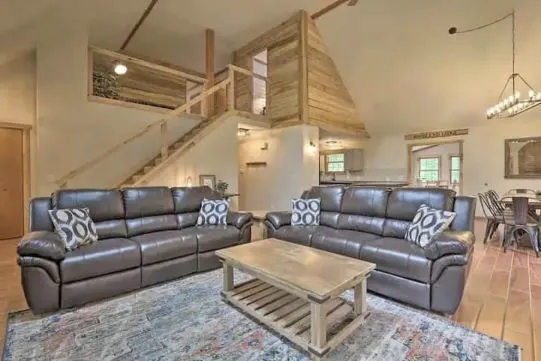The lodge features five bedrooms, three full bathrooms, and generous living space that comfortably accommodates up to 18 guests. The large back deck, fire pits, and trails invite you to unwind outdoors, while the game room and in-home theater provide entertainment for all ages.